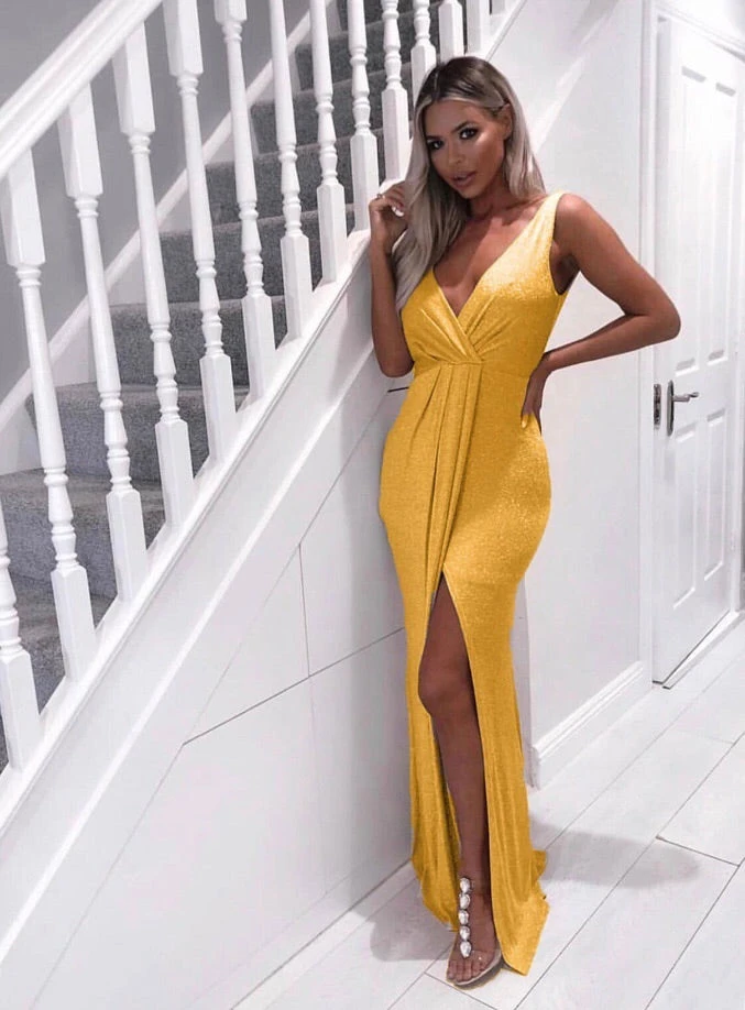 Abito lungo in lurex con spacco e scollo a v, è un capo davvero unico nel suo genere. Indossato si posa perfettamente sulle curve della donna che lo utilizza, regalandole sensualità, grazie allo scollo profondo e lo spacco ed eleganza, due caratteristiche che rendono una donna inimitabile in qualsiasi contesto essa si trovi. Può essere adatto per feste, party, branch, cocktail party e cerimonie. Il tessuto è al 100% Polyester. Si consiglia lavaggio in acqua fredda