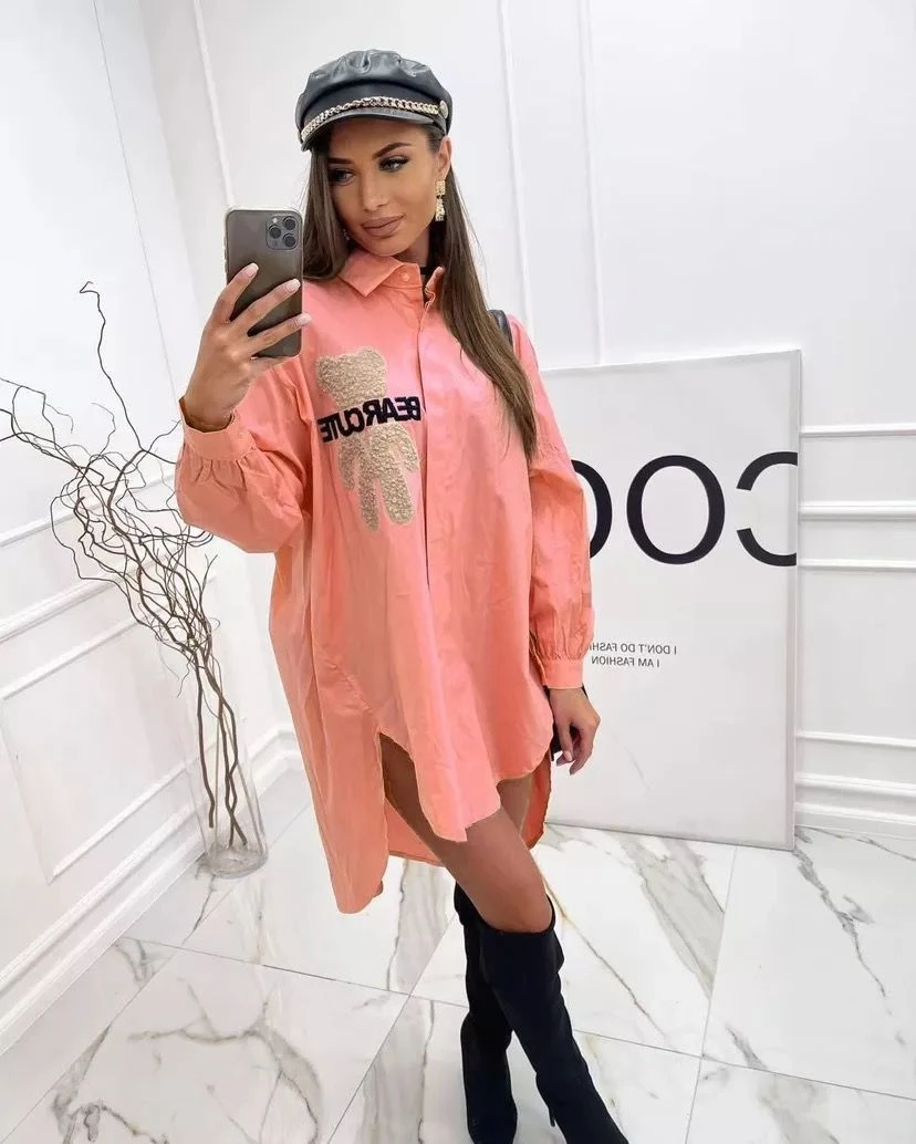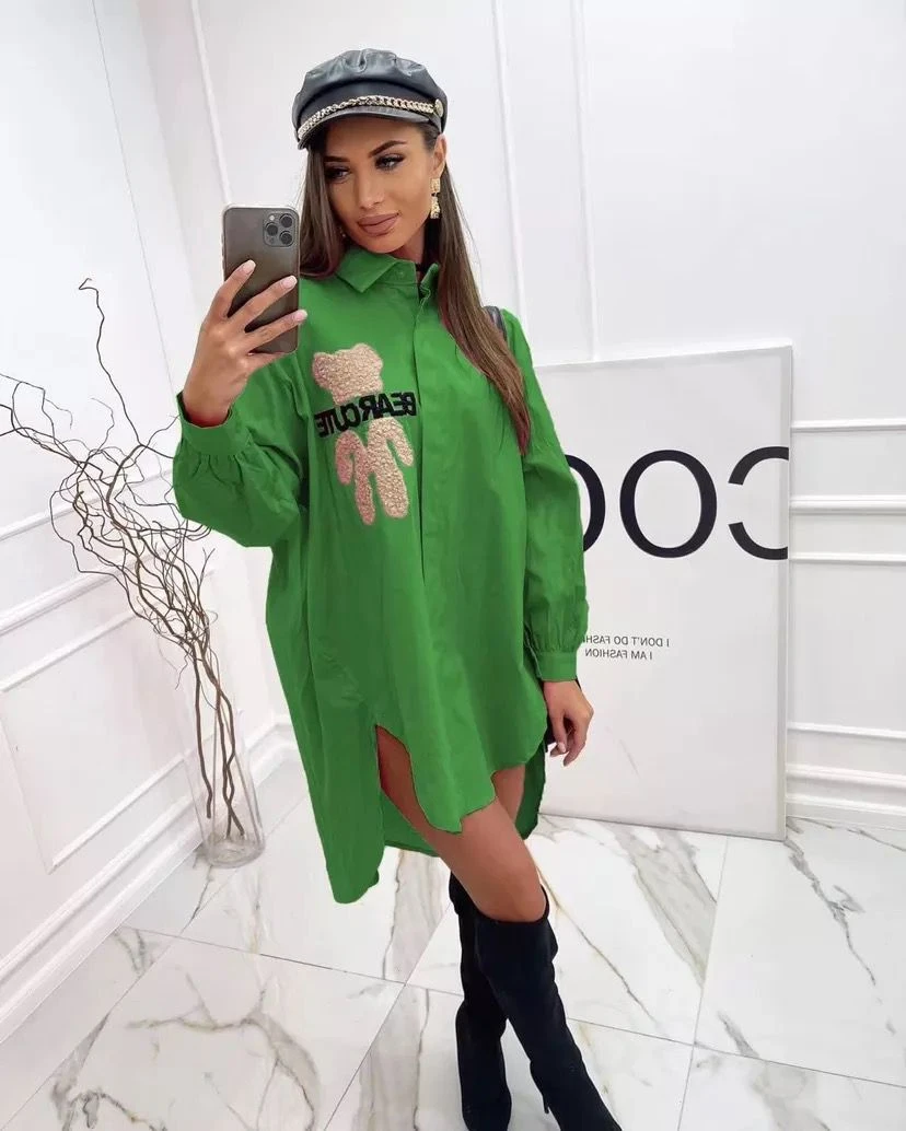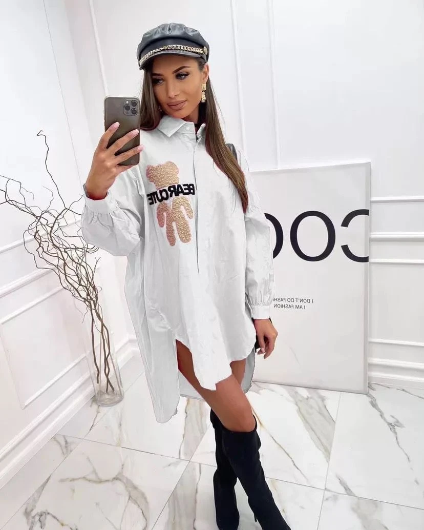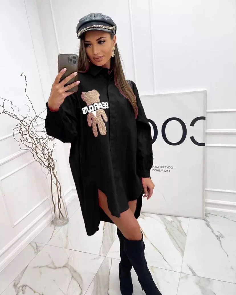Elegante e con stile glamour, è un vestito fantastico. Questo modello ha una vestibilità morbida, che permette di sentirti comoda donando confort e stile. Le sue caratteristiche sono: la sua stupenda stampa a orsacchiotto sempre molto amata da tutte, il suo taglio ampio con maniche lunghe e il classico colletto e chiusura a bottoncini.