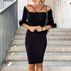Vestito Donna Tubino Costina Spalla Scoperta Bretella Manica Lunga Aderente Sensuale Elegante Casual