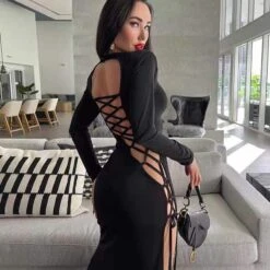 Vestito Donna Lungo Scollo Schiena Profondo Aderente Spacco Alto Lacci Intreccio Elegante