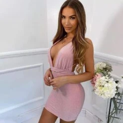 Vestito Donna Tubino Scollo V Profondo Cut Out Pietre Paillettes Gioiello Elegante Sensuale