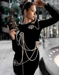 Vestito Donna Tubino Girocollo Bandage Perle Pietre Catene Gioiello Elegante Sensuale