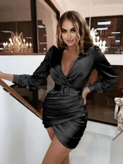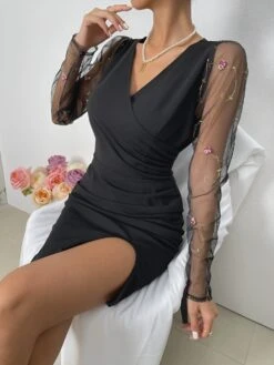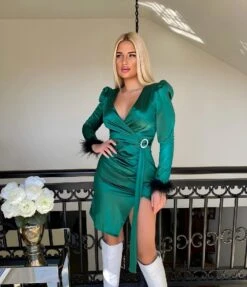 Vestito Donna Tubino Scollo V Profondo Manica Sbuffo Piume Gioiello Spacco Elegante Sensuale