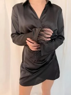 Vestito Donna Tubino Scollo Cuore Coppette Bandage Manica Lunga Piume Cerniera Elegante Sensuale