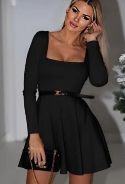 Vestito Donna Scollo Quadrato Gonna Svasata Rush Balze Bicolore Manica Sbuffo Casual Elegante