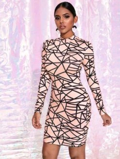 Vestito Donna Tubino Bicolore Bottoni Fantasia Manica Lunga Aderente Casual Elegante Sensuale