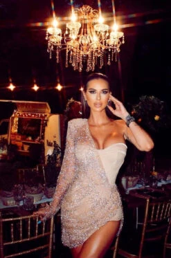 Vestito Donna Tubino Mono Spalla Scollo Cuore Bustier Spacco Paillettes Elegante Sensuale