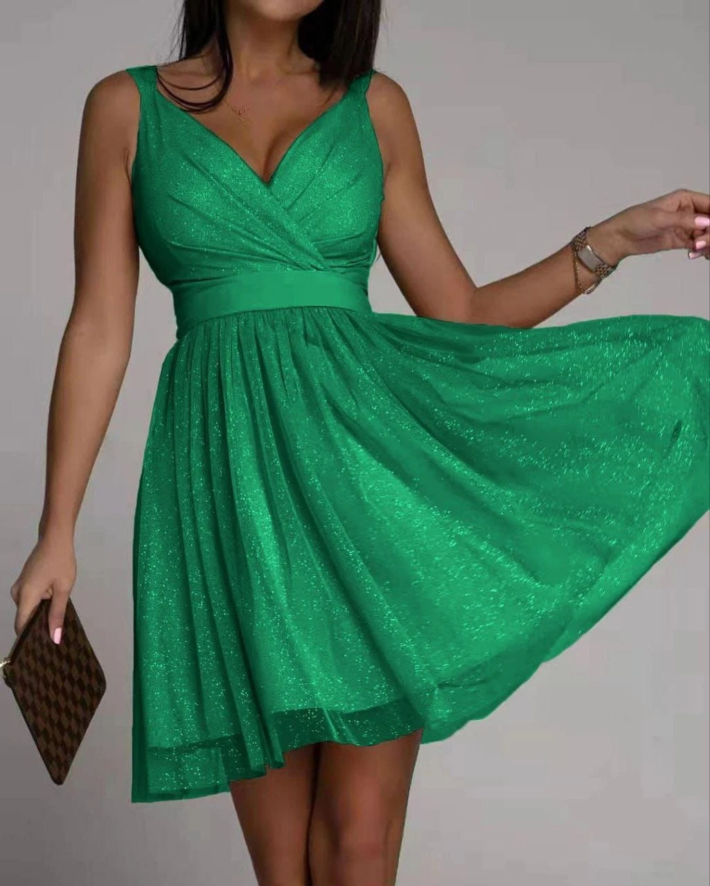 Questo vestito, è un capo inimitabile nel suo genere. Indossato dona alla donna che l’utilizza, charme, sensualità e sex-appeal, tutte caratteristiche che rendono una donna sicura di sé in qualsiasi contesto essa si trovi. Le sue particolarità sono: lo scollo a V, la fascia posta sotto il seno che avvolge il girovita e la gonna svasata con tulle e brillantini. Possono essere affiancati accessori come: gioielli, decolleté e pochette. Può essere adatto per feste, party, cocktail party, brunch e cerimonie. Il tessuto è al 95% poliestere e al 5% elastico. Si consiglia lavaggio a mano e in acqua fredda.