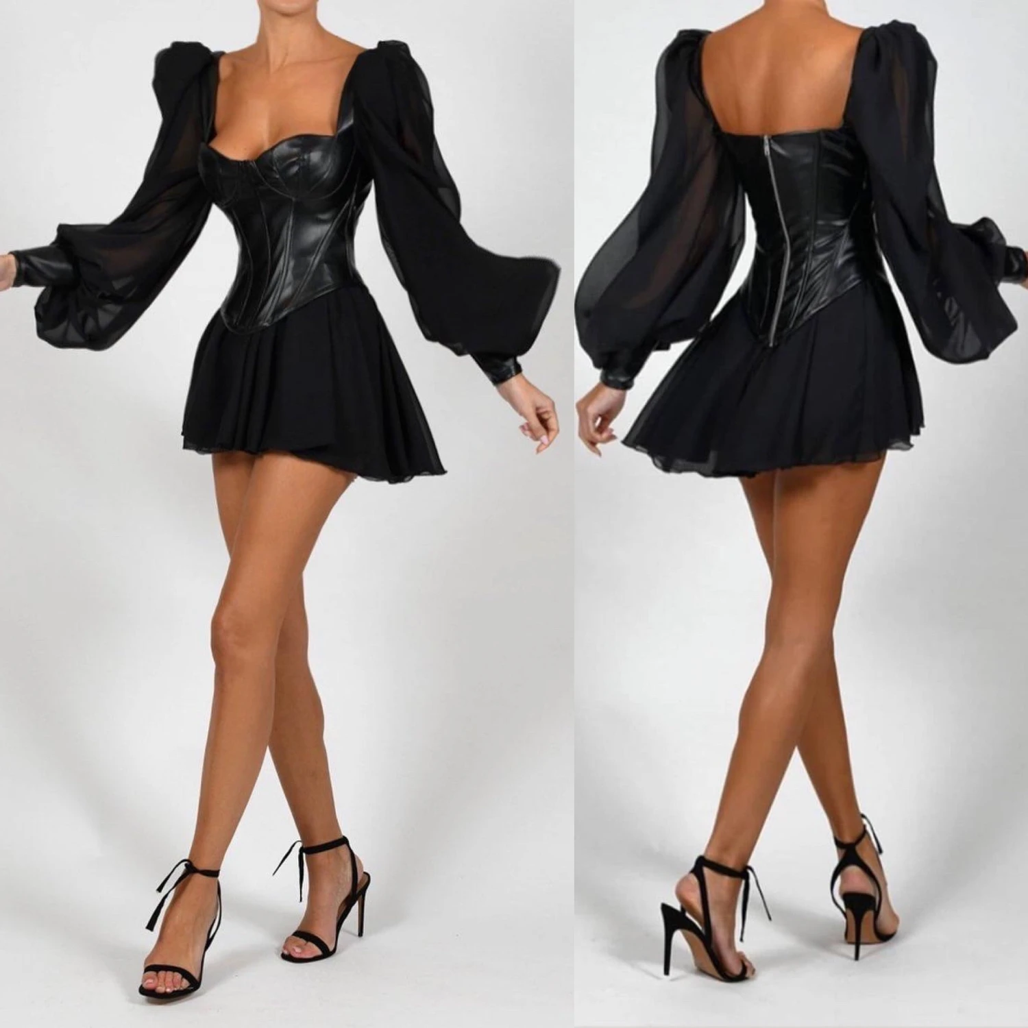 Vestito in ecopelle a bustino con scollo a cuore, con maniche e gonna in chiffon e culotte interna. Indossato si posa perfettamente sulle curve della donna che lo utilizza, rendendo giustizia alla fisicità del corpo femminile su cui si poggia. Questo capo, regala alla donna sensualità ed eleganza, due caratteristiche che stuzzicano lo sguardo dell’uomo che gli passa accanto. Il tessuto interno è al 100% Polyester, mentre il tessuto esterno è al 55% Polyester e al 45% viscosa. Si consiglia lavaggio in acqua fredda