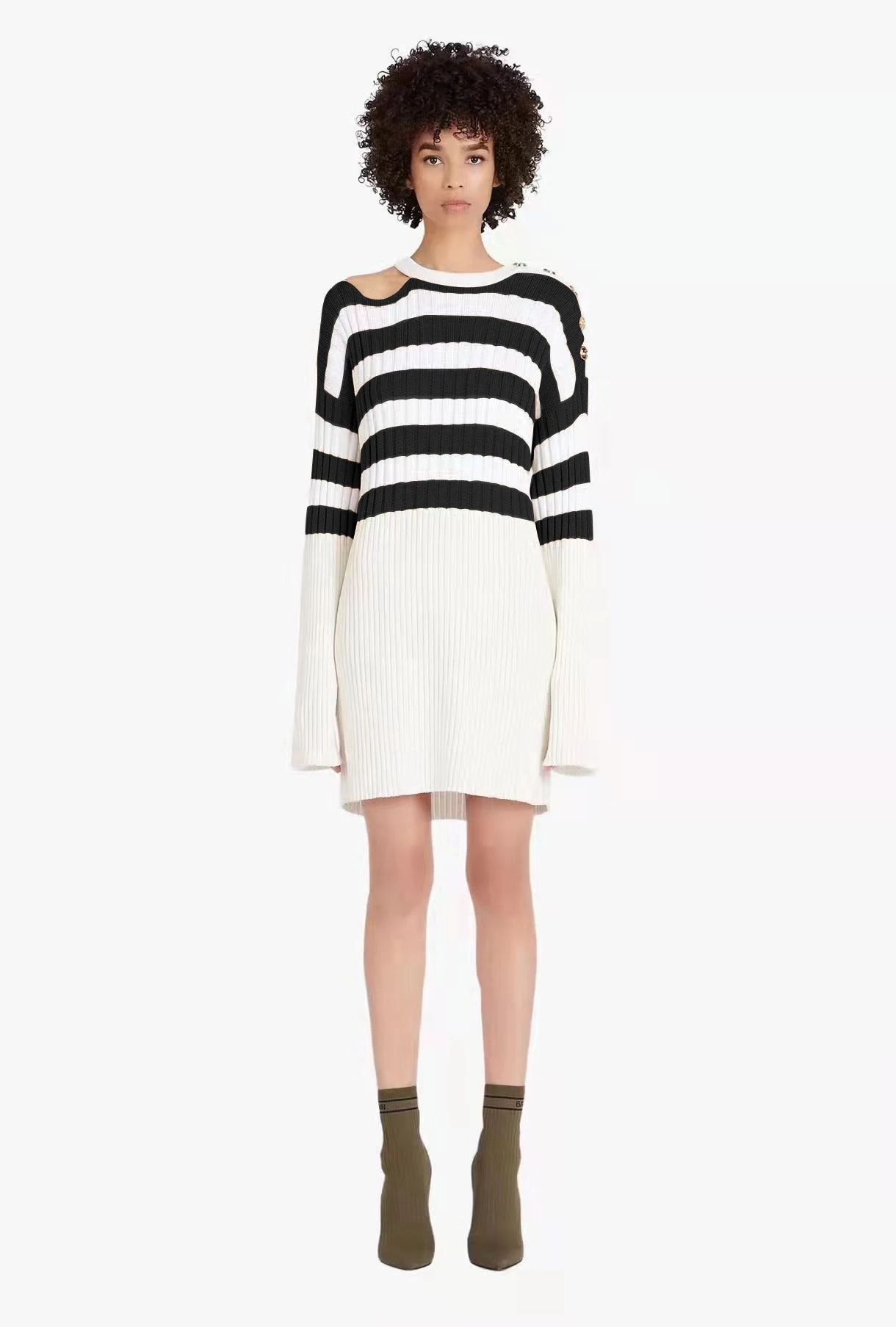 Questo vestito stile casual-elegante è perfetto per chi ama la moda e la comodità, porta un foro sulla spalla destra e sulla sinistra e dei bottoni in oro, fantasia a righe sulla parte superiore e sulle maniche, mentre nella parte inferiore del vestito è completamente in tinta unita. Questo abito è un’aggiunta impeccabile a qualsiasi collezione, facile da abbinare con qualsiasi accessorio: scarpa classica o sportiva, è un capo che non può mancare. Il tessuto è al 90% poliestere e 10% elastan. Si consiglia lavaggio a mano e in acqua fredda.