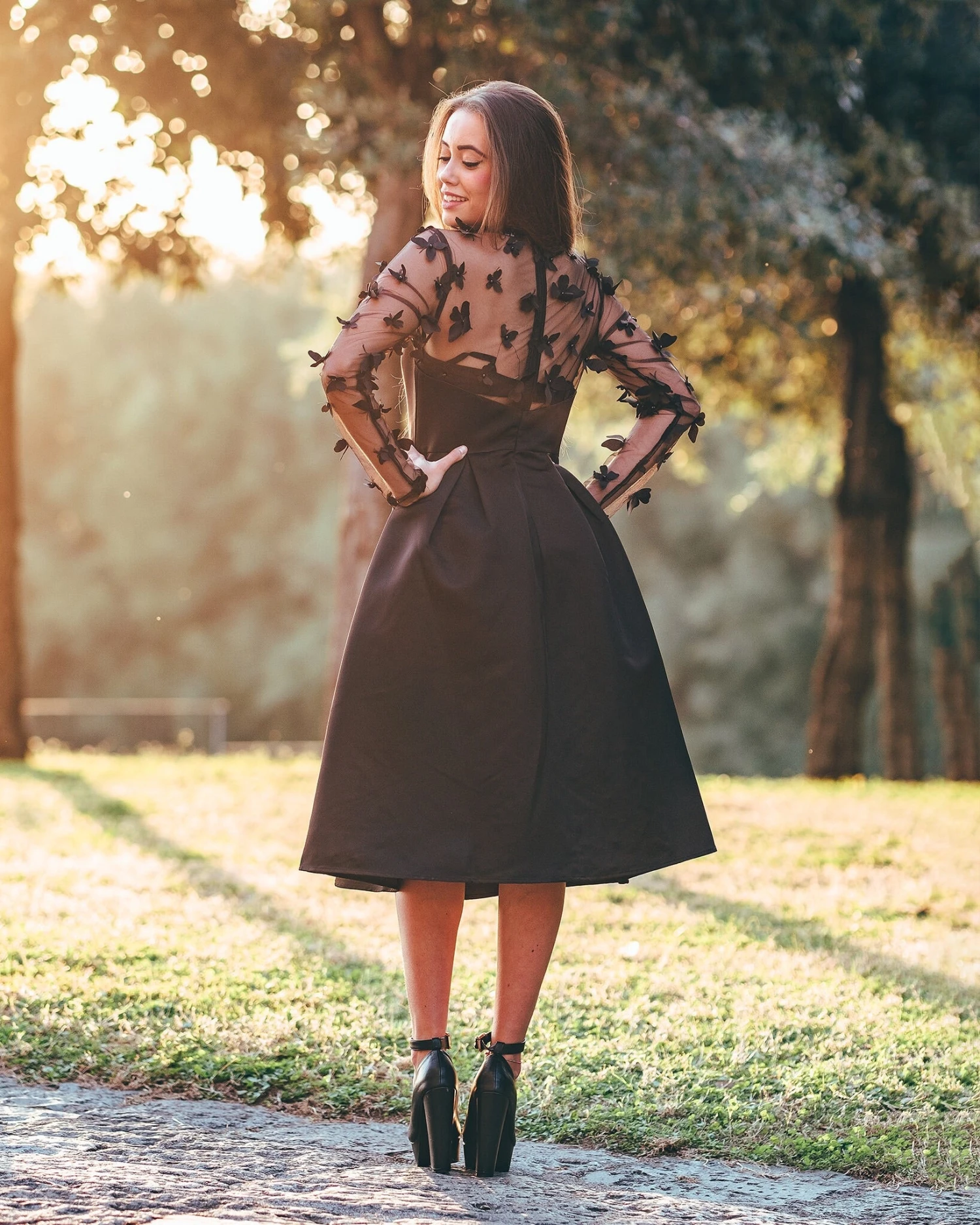 Vestito svasato con manica lunga di tulle semitrasparente, è un capo semplice ma particolare nel suo genere. Indossato si posa morbidamente sulle curve della donna che lo utilizza, regalandole eleganza e charme, due caratteristiche che stuzzicano sempre lo sguardo dell’uomo che le passa accanto. Può essere adatto per cerimonie, feste, cocktail party e party. Il tessuto è al 97% Polyester e al 3% spandex. Si consiglia lavaggio in acqua fredda