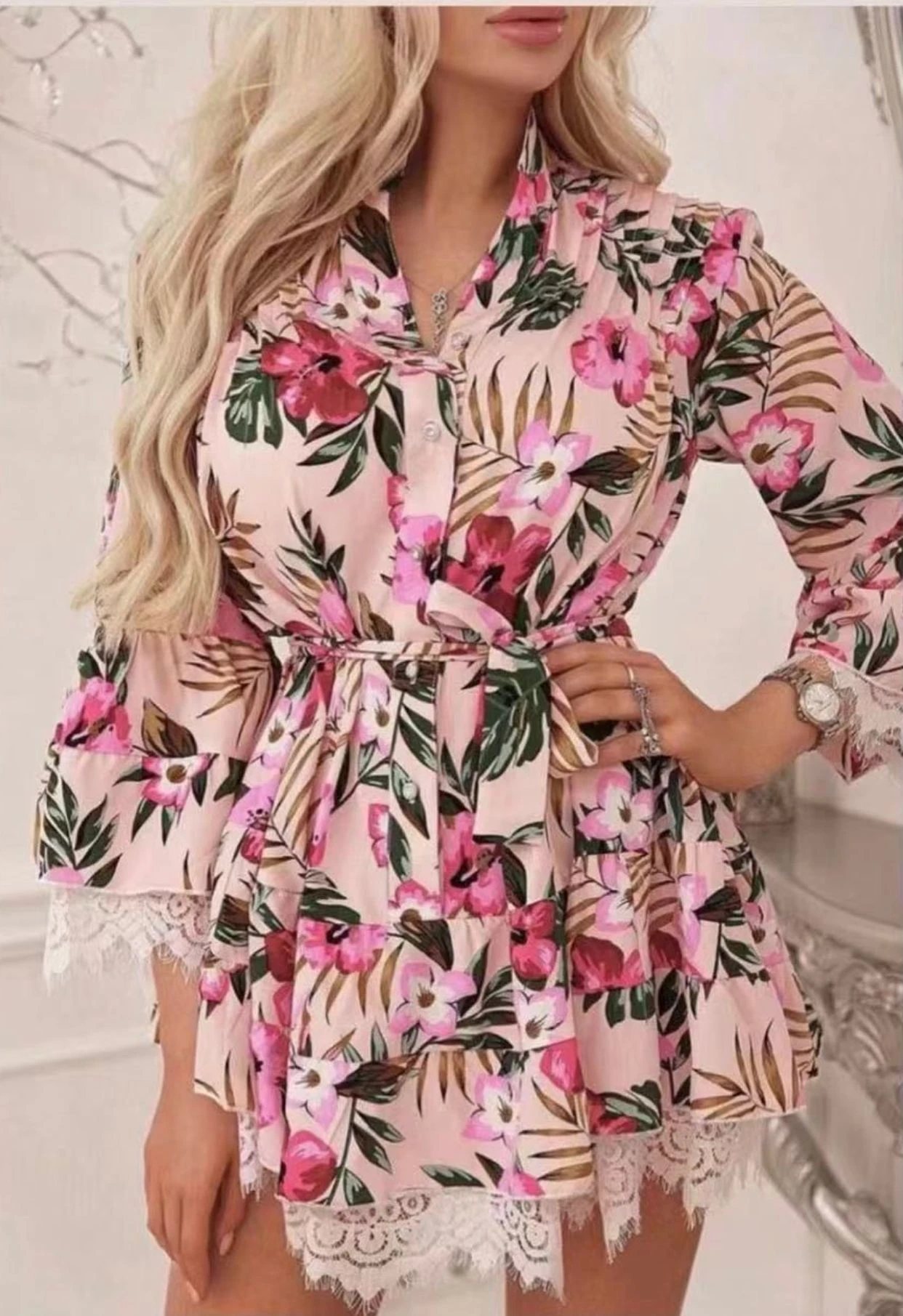 Questo vestito, è un capo davvero unico nel suo genere. Indossato si posa morbidamente sulle curve della donna che l’utilizza, regalandole charme e sensualità, due caratteristiche che ogni donna ricerca in un capo. Le sue particolarità sono: il merletto, posto nella parte inferiore del capo e sulle maniche, e la fantasia a fiori, che richiama la stagione primaverile che andremo ad affrontare. Possono essere accostati accessori come: borse di piccole, medie e grandi dimensioni e decolté o sandali bassi. Può essere adatto per feste, party, cocktail party, branch e cerimonie. Il tessuto è al 90% polyester 10% spandex. Si consiglia lavaggio a mano in acqua fredda.