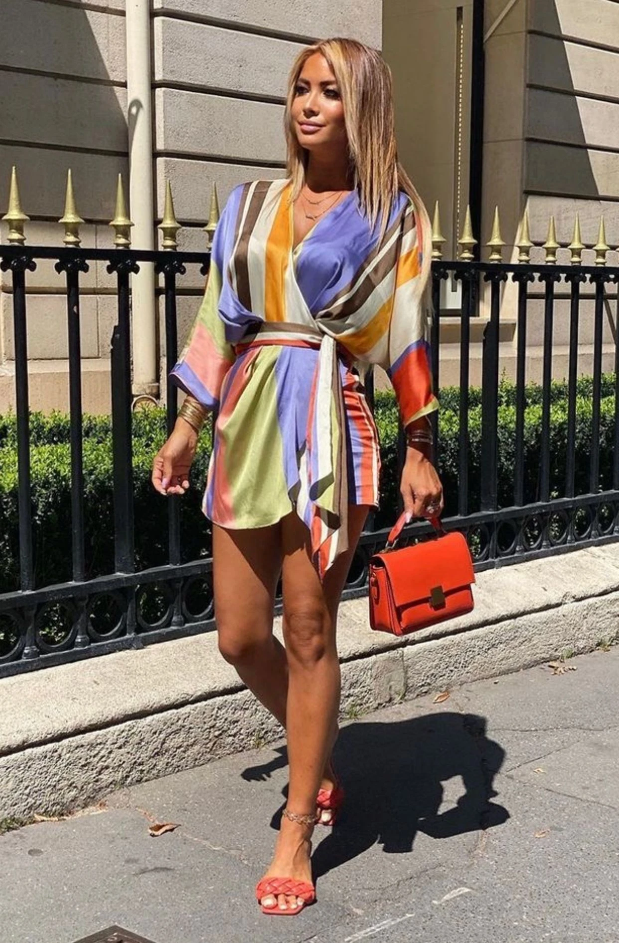 Questo vestito, è un capo davvero unico nel suo genere. indossato si posa morbidamente sulle curve della donna che l’utilizza, regalandole charme e sex-appeal, due caratteristiche che rendono una donna sicura di sé in qualsiasi contesto essa si trovi. Le sue particolarità sono: il multicolore e la fascia che avvolge il girovita. Può essere adatto per feste, party, cocktail party, branch e cerimonie. Possono essere accostati accessori come decoltè e pochette. Il tessuto è al 95% polyester 5% elastan. Si consiglia lavaggio a mano e in acqua fredda.
