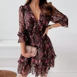 Vestito Donna Scollo V Morbido Manica Sbuffo Fiocco Velato Cut Out Fantasia Fiori Sensuale Elegante