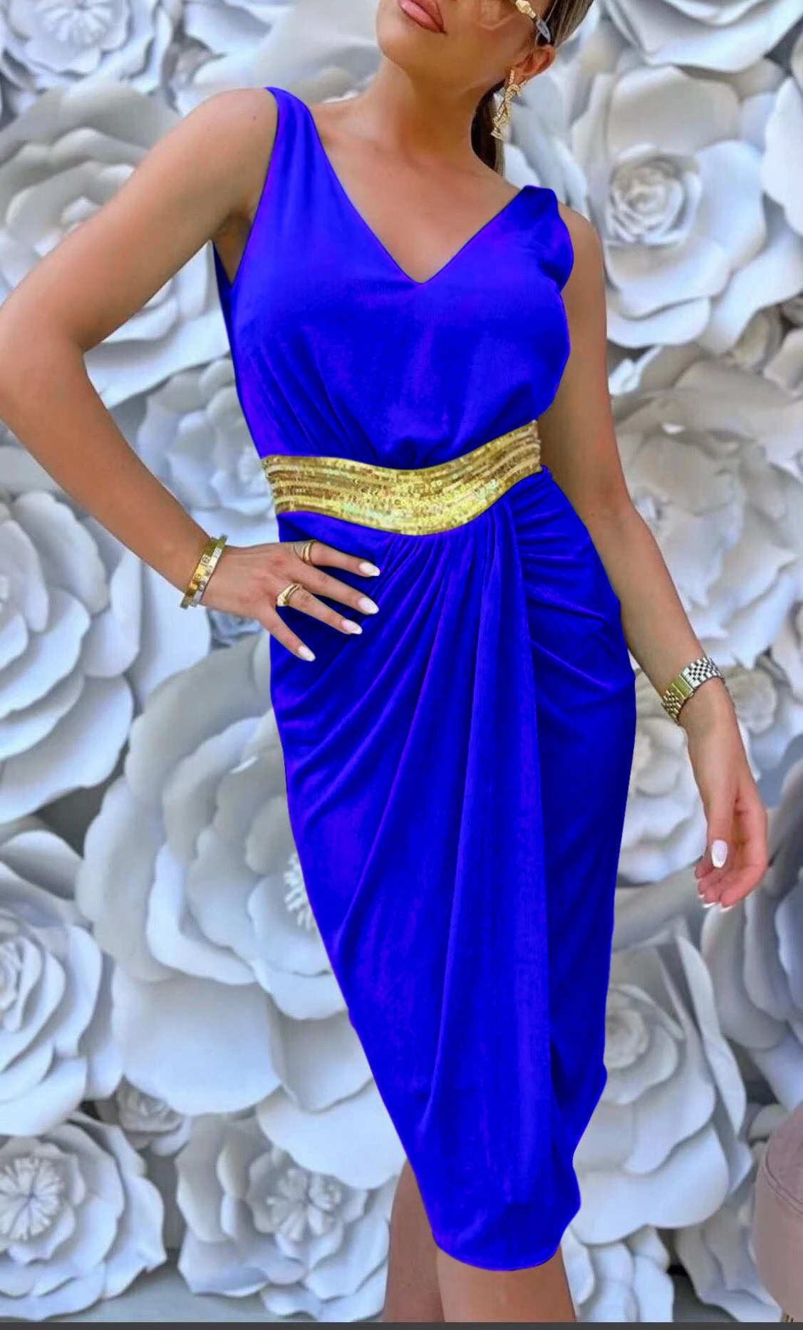 Questo vestito, è un capo d’abbigliamento molto amato dalle donne, grazie al suo stile glamour. E’ un capo inimitabile nel suo genere, indossato si posa leggermente sulle curve della donna che l’utilizza, regalandole sensualità e sex-appeal, caratteristiche che rendono la donna sicura di sé in qualsiasi occasione. Le particolarità sono: le bretelle, lo scollo a V, la fascia color oro e la gonna intrecciata. Può essere adatto per serate come: feste, party, cocktail party, brunch e cerimonie. Il tessuto è al 95% Poliestere e al 5% elastico. Si consiglia lavaggio a mano e in acqua fredda.
