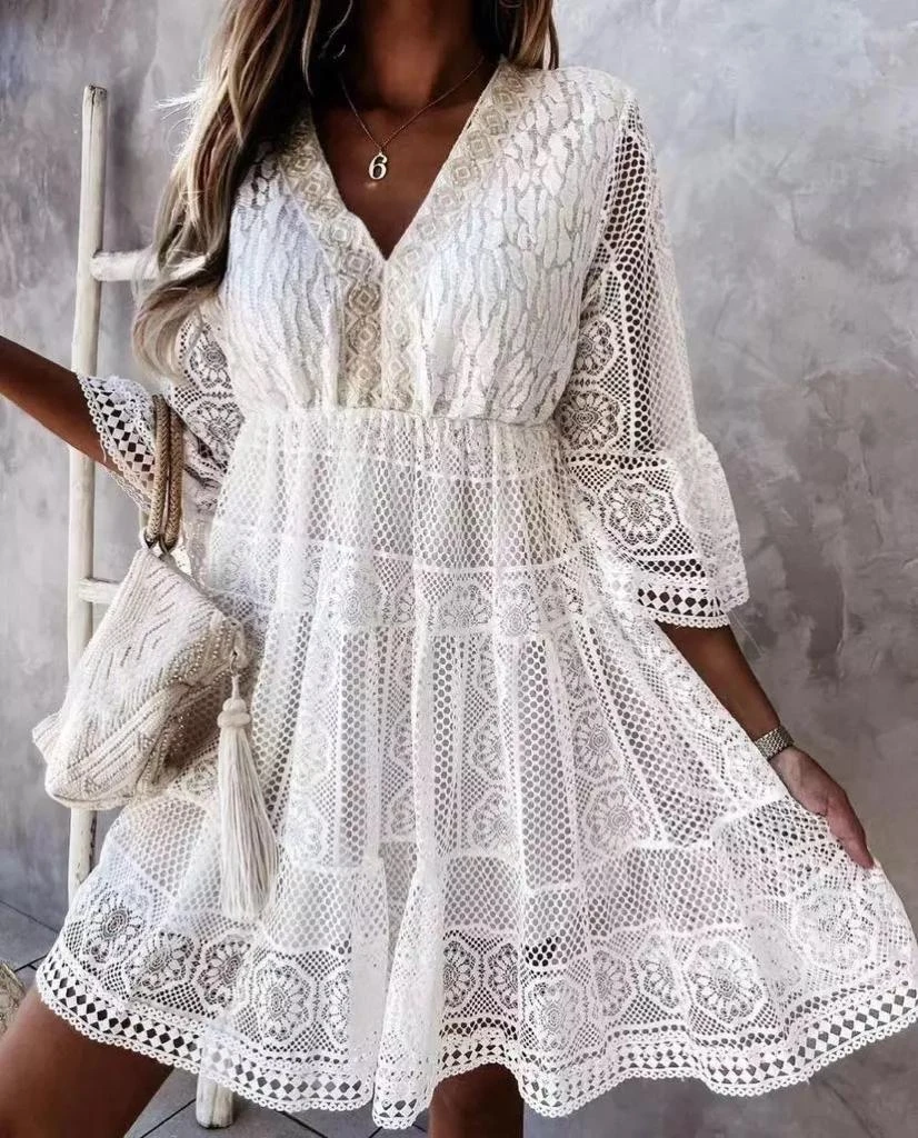 Questo originale vestito è sicuramente disegnato per una donna che ama essere sempre alla moda. E’ un modello stupendo e adatto a qualsiasi tipologia di donna grazie alla sua semplicità. Le sue particolarità sono: il tessuto in pizzo sangallo, lo scollo a V, le maniche a tre quarti, la gonna morbida e i ricami floreali sul tessuto. Il tutto lo rendono un capo unico, è sicuramente un modello amatissimo da tutte noi e assolutamente insostituibile. Indossato si posa morbidamente sul corpo, ti permette di sentirti a tuo agio in ogni occasione. Ottimo per uscite in costiera o giornaliere. Il tessuto è al 95% poliamide e al 5% elastico. Si consiglia lavaggio a mano e in acqua fredda.