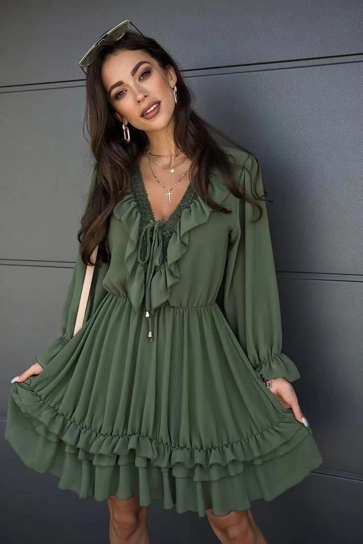Stupendo vestito da donna con stile casual-elegante adatto per una donna che ama la semplicità. Le sue caratteristiche sono: il tessuto in chiffon, lo scollo a V con lacci regolabili, i volant ,la manica morbida, e la sua vestibilità morbida, per dare più comodità. Questo modello è un classico ma sempre alla moda. Può essere abbinato con vari accessori: gioielli, borse, giacche, tacchi alti, ma perfetto anche con scarpe sportive e sandali. Adatto per uscite giornaliere, pomeridiane e serali o eventi speciali, lavoro, feste; insomma un capo così ti salverà dalle giornate indecise. Il tessuto è al 95% poliestere e al 5% elastico. Si consiglia lavaggio a mano e in acqua fredda.