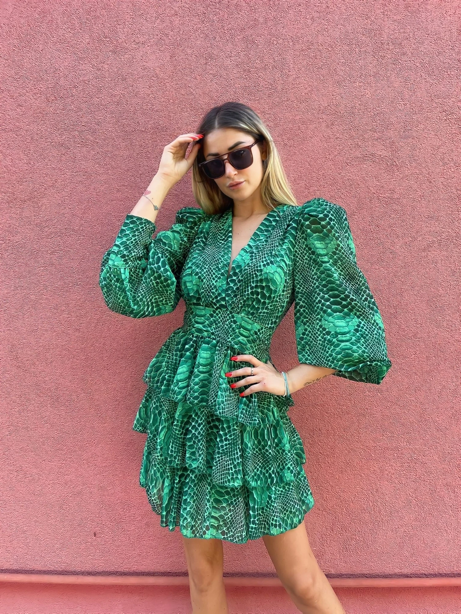 Questo vestito, è un capo molto semplice ma particolare nelle sue caratteristiche. Indossato si posa leggiadramente sulle curve della donna che l’utilizza, regalandole comodità e spensieratezza, caratteristiche che ogni donna ricerca per fronteggiare le giornate d’autunno. Le sue peculiarità sono: lo scollo a V, la manica a sbuffo e le balze poste nella parte inferiore del capo. Possono essere affiancati accessori come: decolleté, sandali, borse di varie dimensioni e pochette. Può essere adatto per giornate più easy, o per serate più impegnative. Il tessuto è al 95% poliestere e al 5% elastico. Si consiglia lavaggio a mano e in acqua fredda.