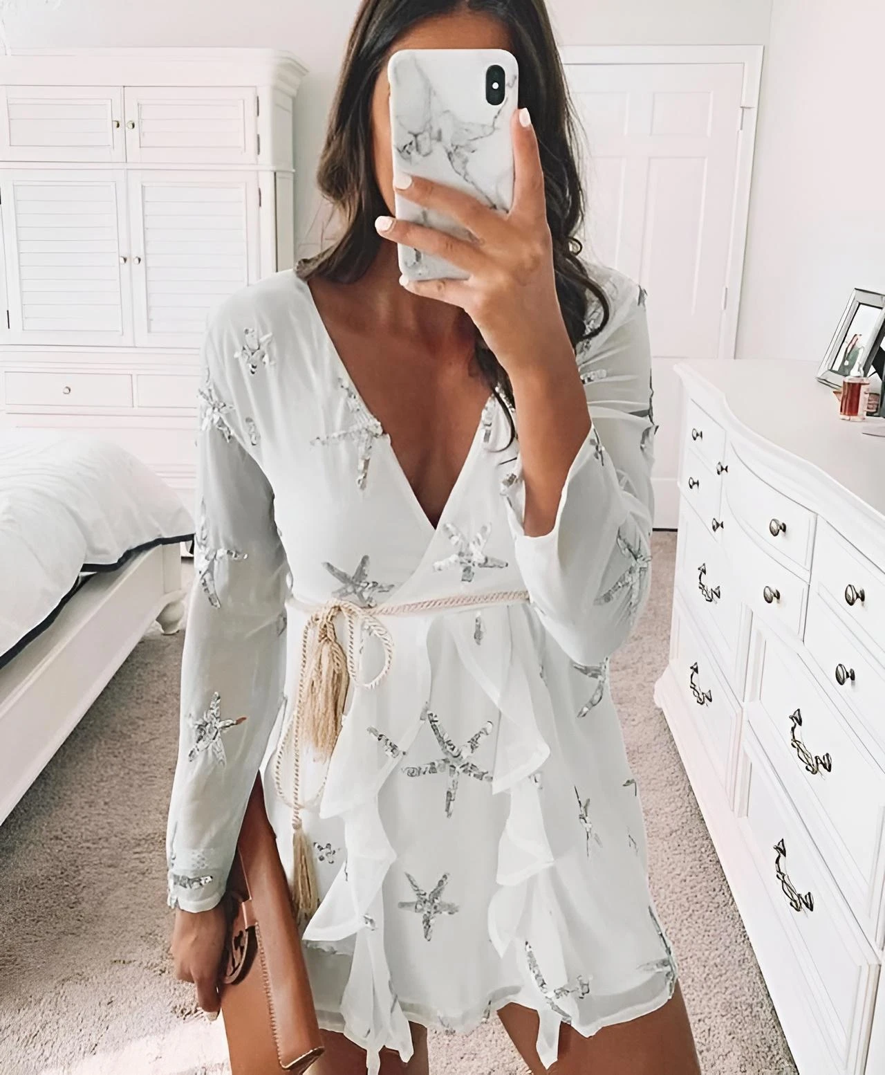 Questo vestito, è un capo inimitabile nel suo genere. Indossato dona alla donna che l’utilizza, charme, sensualità e sex-appeal, tutte caratteristiche che rendono una donna sicura di sé in qualsiasi contesto essa si trovi. Le sue particolarità sono: lo scollo a V, le maniche a sbuffo, la fantasia con stelle marine, le rush e la gonna svasata. Possono essere affiancati accessori come: gioielli, decolleté e pochette. Può essere adatto per feste, party, cocktail party, brunch e cerimonie. Il tessuto è al 95% poliestere e al 5% elastico. Si consiglia lavaggio a mano e in acqua fredda.