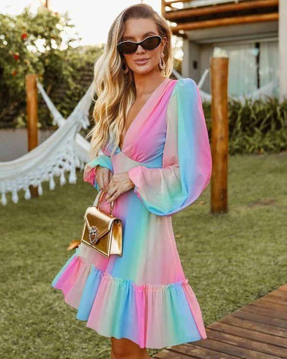 Questo vestito, è un capo davvero unico nel suo genere. Indossato si posa morbidamente sul corpo della donna che l’utilizza, regalandole eleganza e charme, due caratteristiche che ogni donna ricerca in un capo. Le sue particolarità sono: le maniche a sbuffo, lo scollo a v e il multicolore. Possono essere accostati accessori come decoltè, sandali, borse di varie dimensioni e gioielli. Può essere adatto per feste, party, cocktail party, branch e cerimonie. Il tessuto è al 90% poliestere e al 10% spandex. Si consiglia lavaggio a mano in acqua fredda.