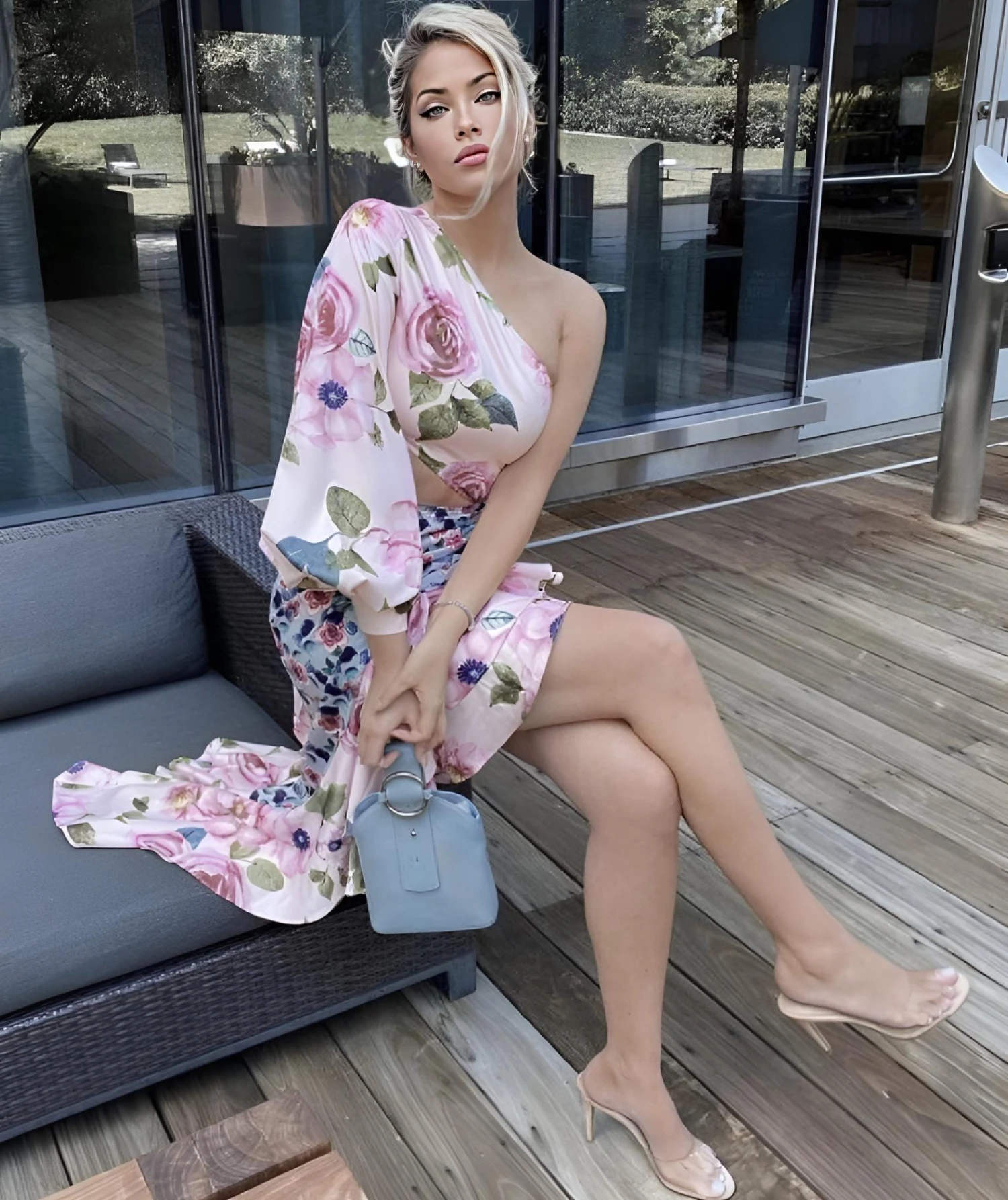 L’eleganza e la sensualità, sono le due caratteristiche che si richiedono per accedere negli eventi importanti, proprio per questo che ti proponiamo questo stupendo e particolare vestito a tubino. Indossato si posa avvolgendo in maniera incisiva sulle curve della donna che l’utilizza, regalandole sex-appeal e charme. Le sue peculiarità sono: il mono-spalla, la manica a sbuffo, il cut out sul fianco e i volant, tutto accompagnato dalla fantasia a rose che rende questo capo ancora più inimitabile. Possono essere adornati accessori come: pochette, decolleté e sandali. E’ adatto per. eventi mondani, cerimonie, party e cocktail party. Il tessuto è al 95% poliestere e al 5% elastico. Si consiglia lavaggio a mano e in acqua fredda.