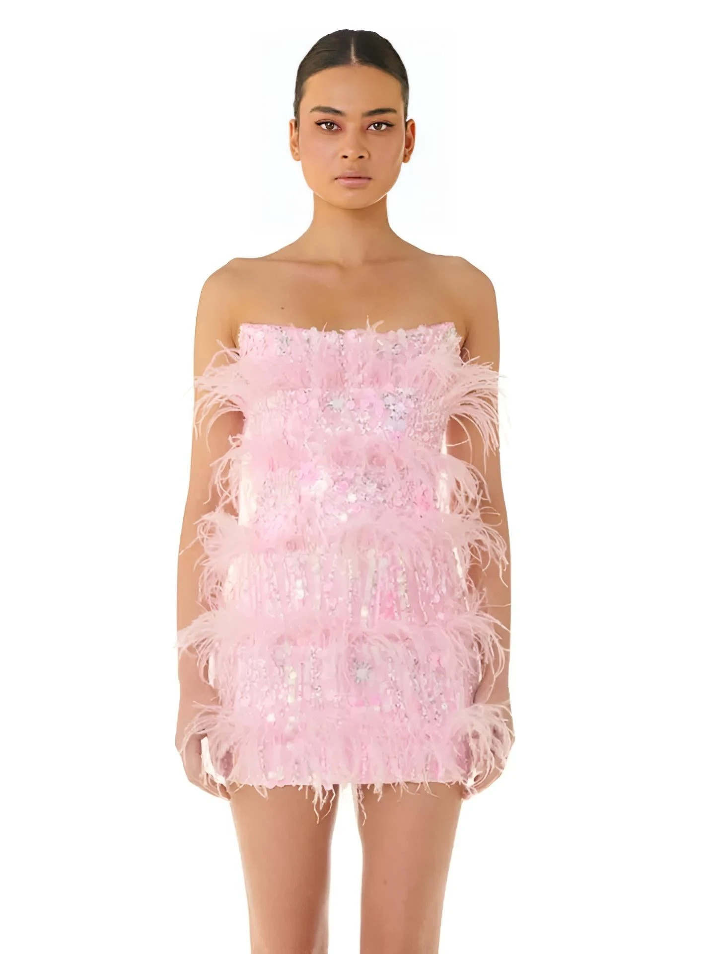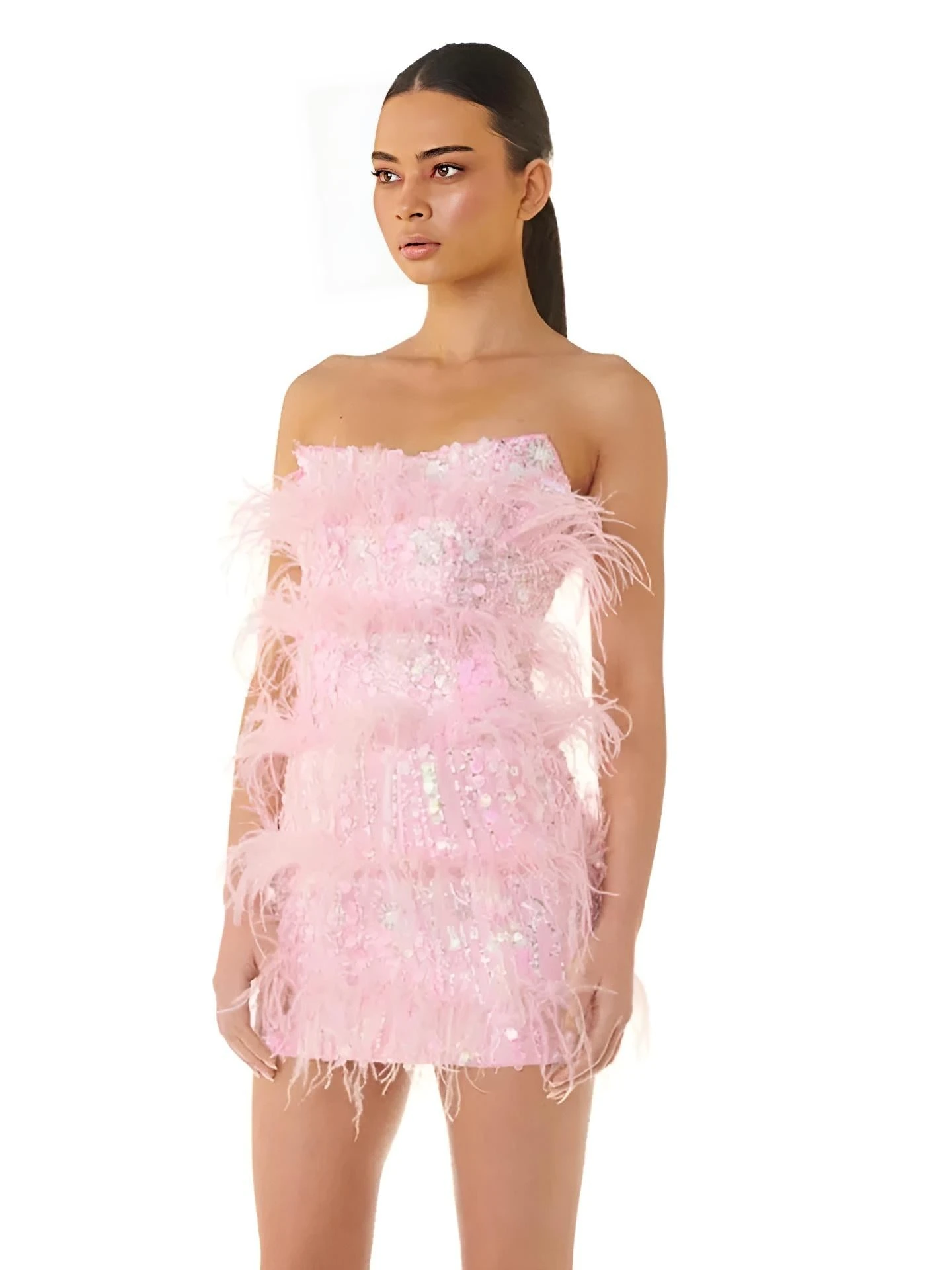 Questo vestito è un capo molto particolare nei suoi dettagli. Indossato si posa avvolgendo perfettamente le curve della donna che l’utilizza, regalandole sensualità e sex-appeal, due caratteristiche che ogni donna ricerca in un capo per sentirsi una vera bomba sexy in qualsiasi occasione decida di utilizzarlo. Le sue peculiarità sono: le piume, le paillettes, che regalano quell’effetto gioiello che stuzzica sempre lo sguardo dell’uomo e l’aderenza. Possono essere affiancati accessori come: pochette, sandali e decolleté. Può essere adatto per: party, cocktail party, brunch, eventi mondani e cerimonie. Sarai unica nelle occasioni più importanti. Il tessuto è al 95% poliestere e al 5% elastico. Si consiglia lavaggio a mano e in acqua fredda.