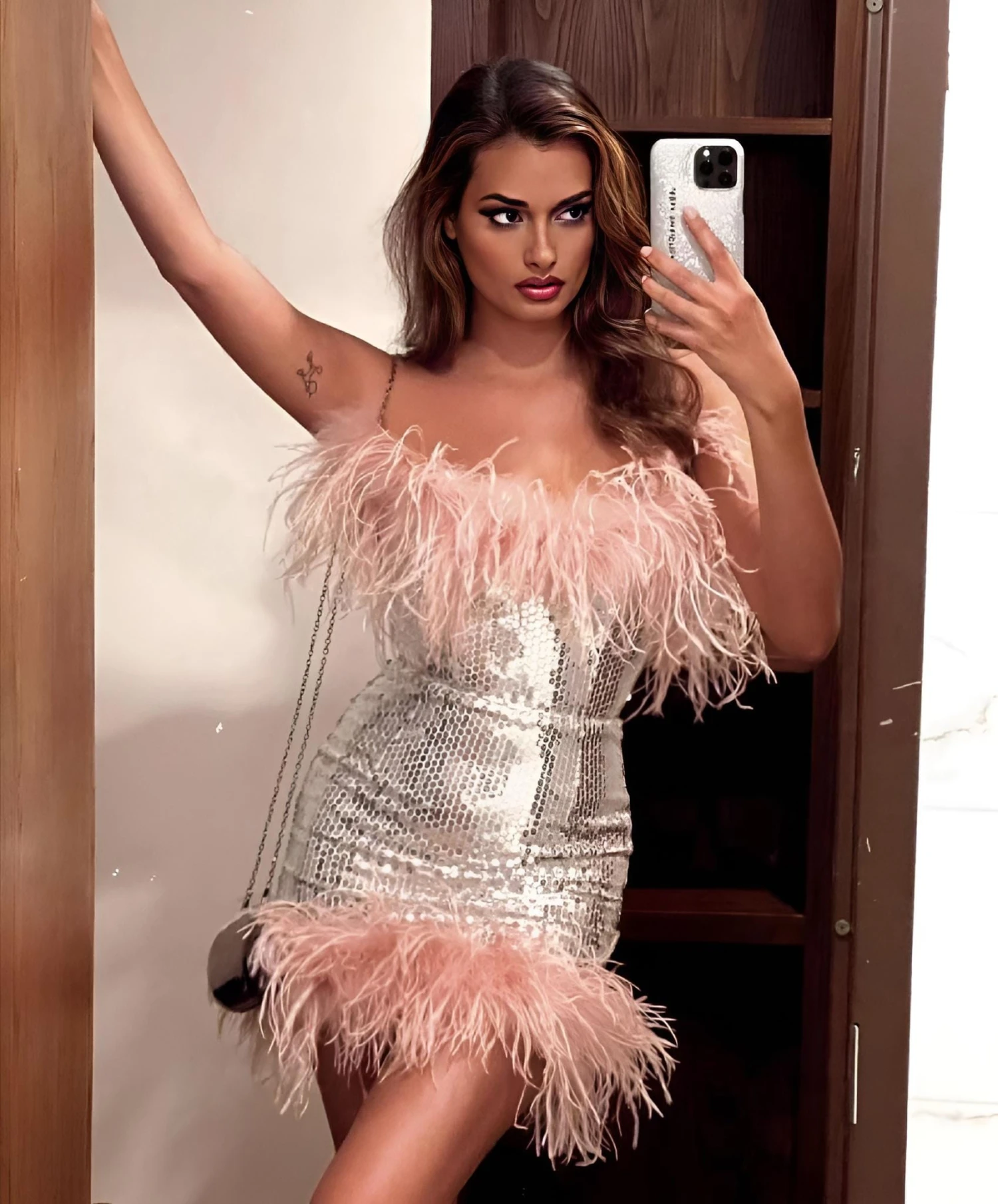 Sexy vestito a fascia aderente, accentua perfettamente le curve della donna che l’utilizza, regalandole personalità e sex-appeal. L’effetto che sprigiona questo stupendo capo, mette in evidenza la sensualità di ogni donna, regalandole charme e stile, due caratteristiche che ogni donna ricerca in un capo. Le sue particolarità sono: il taglio a tubino, le paillettes in argento e le piume rosa che delineano la parte iniziale e finale del vestito. Può essere arricchito con vari accessori semplici: borse, giacche, tacchi alti, ma perfetto anche con sandali. Ottimo anche per cocktail party, serate in discoteca, cerimonie, ecc. Il tessuto è al 95% poliestere e al 5% elastico. Si consiglia lavaggio a mano e in acqua fredda.